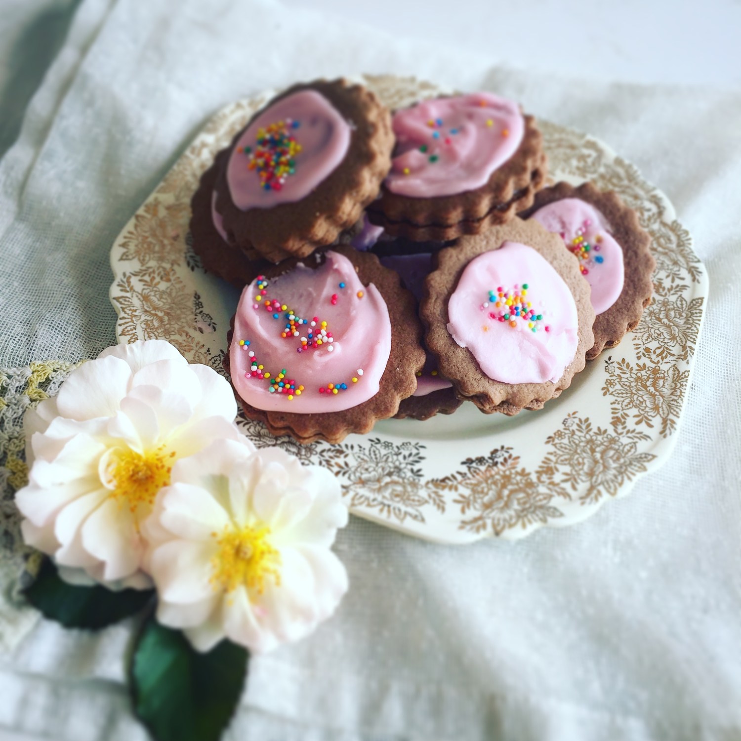 Belgian biscuits are one of my favourites. A slightly spicy shortbread type biscuit, they’re traditionally sandwiched with raspberry jam and garnished with a glacé cherry on top. Nana always iced hers with pink icing and a sprinkling of 100’s and 1000’s, or sometimes raspberry jelly crystals. I remember biscuits in the shape of the moon, stars and flowers.