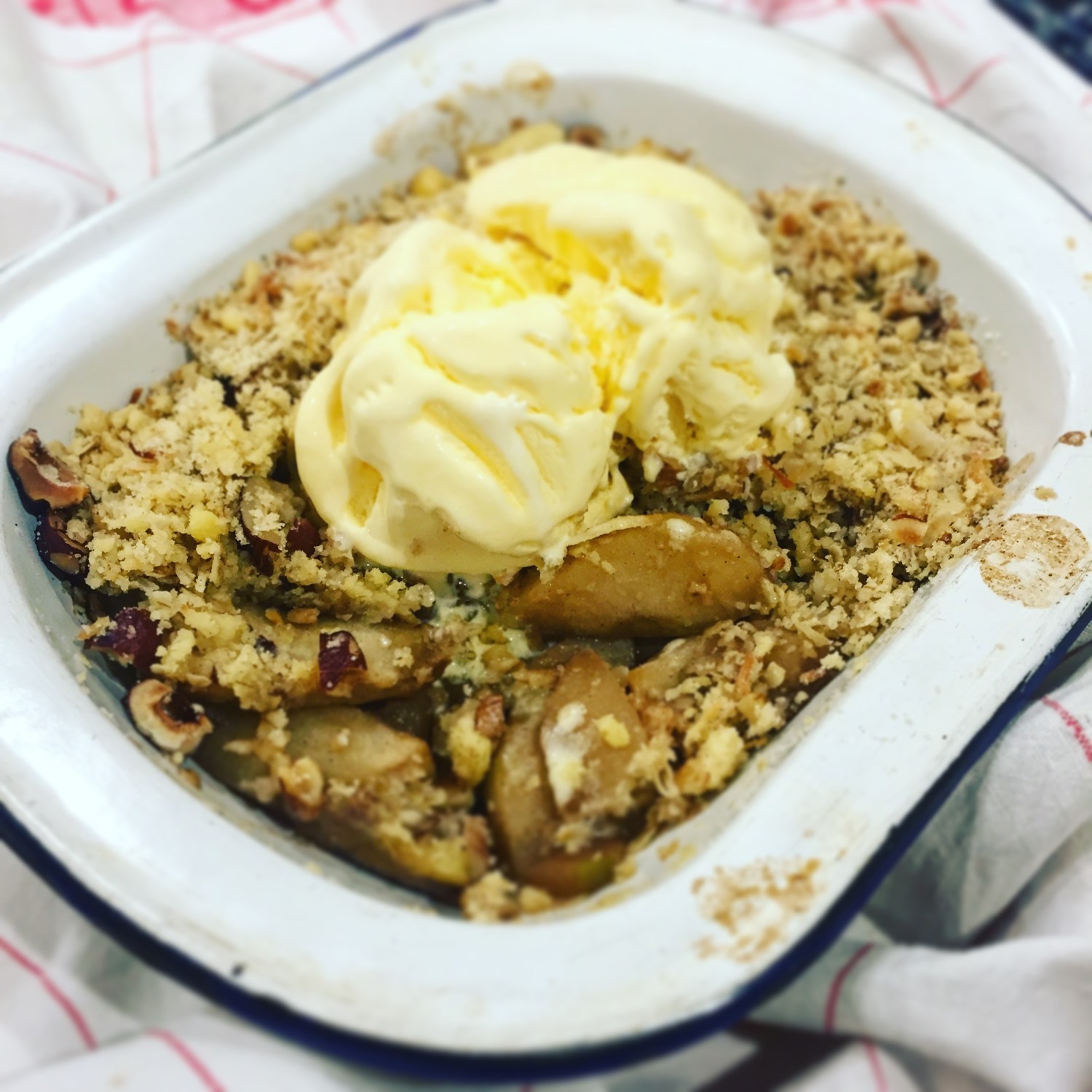 It’s one of my favourite things about the cooler months. Less humidity = less chance of my hair transforming into a giant ball of fluffiness. Another of my winter favourites is a good, nourishing fruit crumble. I nearly always use apple, but maybe you’ve got some summer fruits that you’ve preserved, or of course tinned fruit is also a winner. This one has rolled oats in the crumble, so pairing that with fruit essentially means it’s breakfast. And we all know ice cream is dairy so that’s hitting 3 food groups!