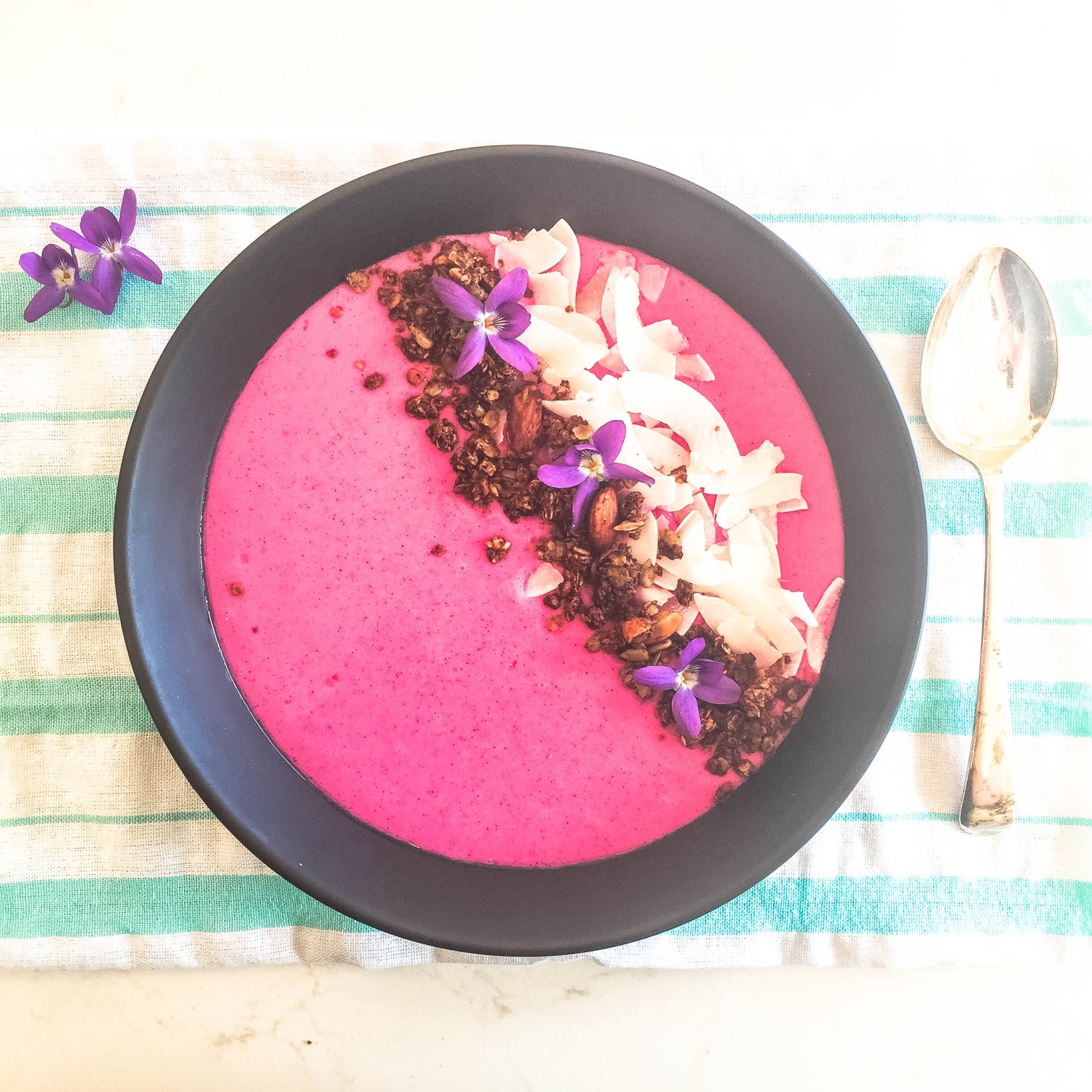 I don’t even know when smoothie bowls were invented. Did someone just pour a smoothie into a bowl and eat it with a spoon? Anyhoo, this one is divine. I came across frozen pitaya (dragonfruit) at a local store and was smitten with it’s bright pink colour. Combined with banana, mango and pineapple it makes a refreshing breakfast. Add some chocolate hazelnut granola and it becomes a wee bit decadent.