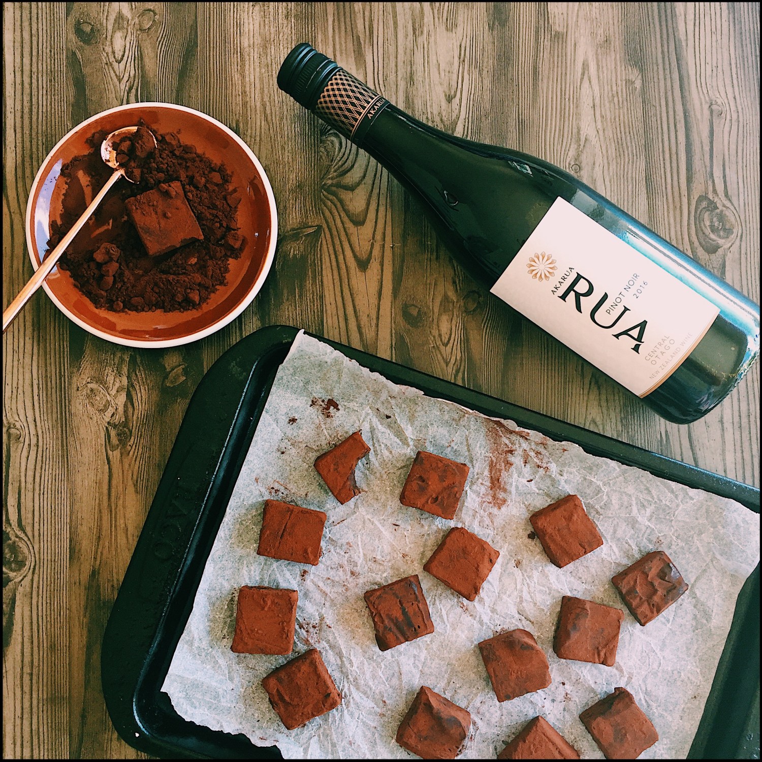 These truffles are utterly delicious. They’re infused with my husbands favourite wine, Akarua Rua pinot noir. We visited this winery in Central Otago about 6 years ago on a child-free mini break (bliss), and ever since, we’ve always made sure there are a couple of bottles in the wine rack. The pinot is described as having layers of sweet ripe, red berries which pairs beautifully with some really dark chocolate.