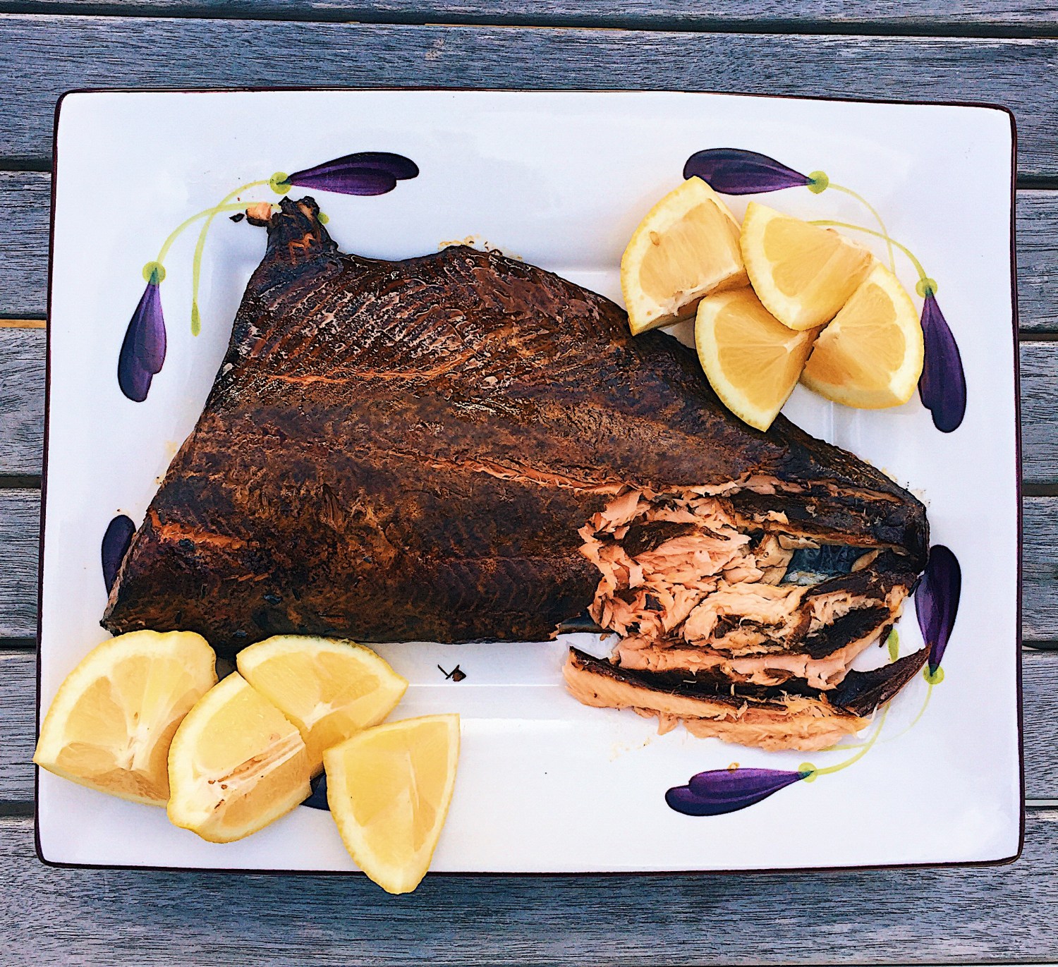This is such a simple method with really delicious results. The prep only takes a couple of minutes, and the smoking is roughly 40 minutes so it’s pretty quick. The salmon is really flaky and tender and melts in your mouth. We like to serve it as a main with a good salad and/or veggies, or as a party snack with blinis and a good cream cheese.