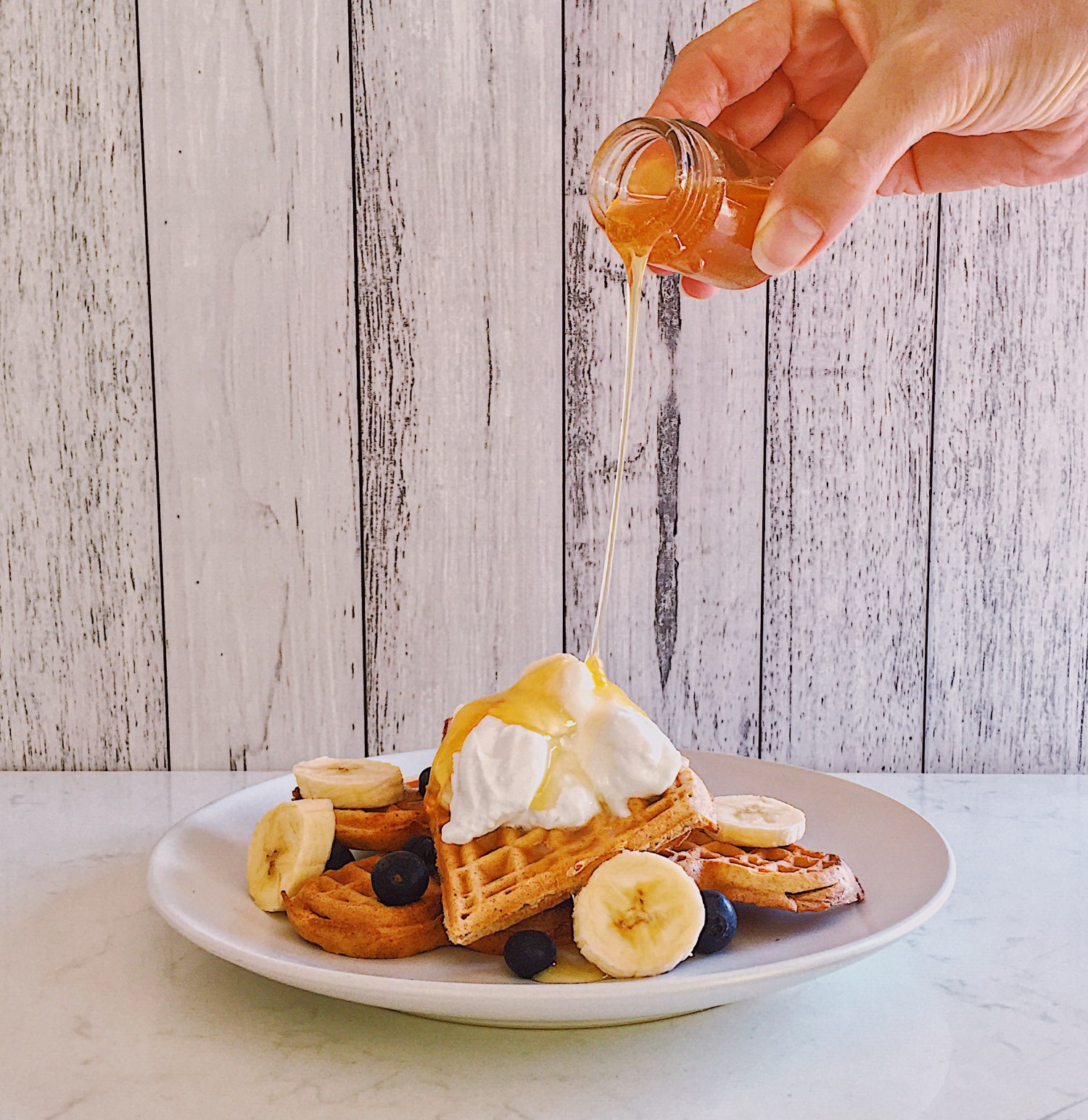 I served my waffles with a big dollop of Raglan coconut yoghurt, banana, blueberries and a big drizzle of spiced honey. Delish!