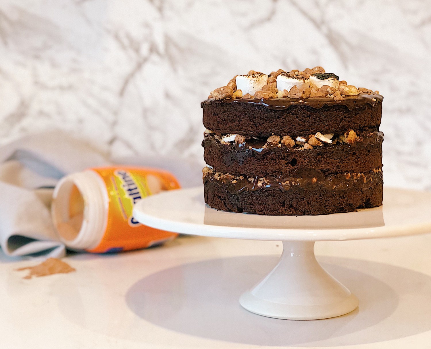 With your index finger, gently tuck the second strip of acetate between the cake ring and the top ¼” of the first strip of acetate. Set a cake round on top and gently press down. Repeat the steps from the bottom layer – soak, fudge sauce, crumbs, marshmallows, fudge sauce.