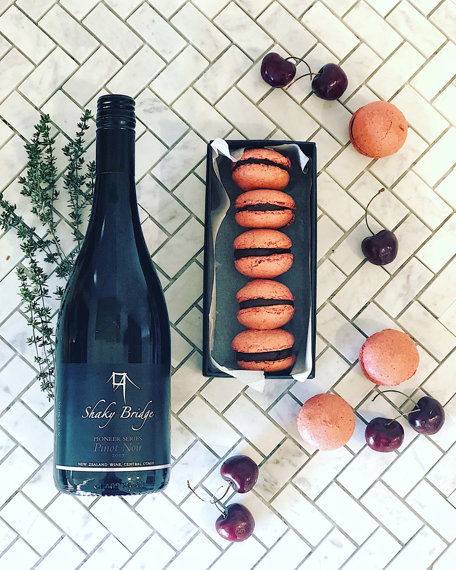 For these macarons, I chose to pair tart cherry with a rich Pinot Noir ganache. I used Fresh-As freeze dried cherries which I ground up in a mini food processor, and a lovely Pinot from Shaky Bridge.
