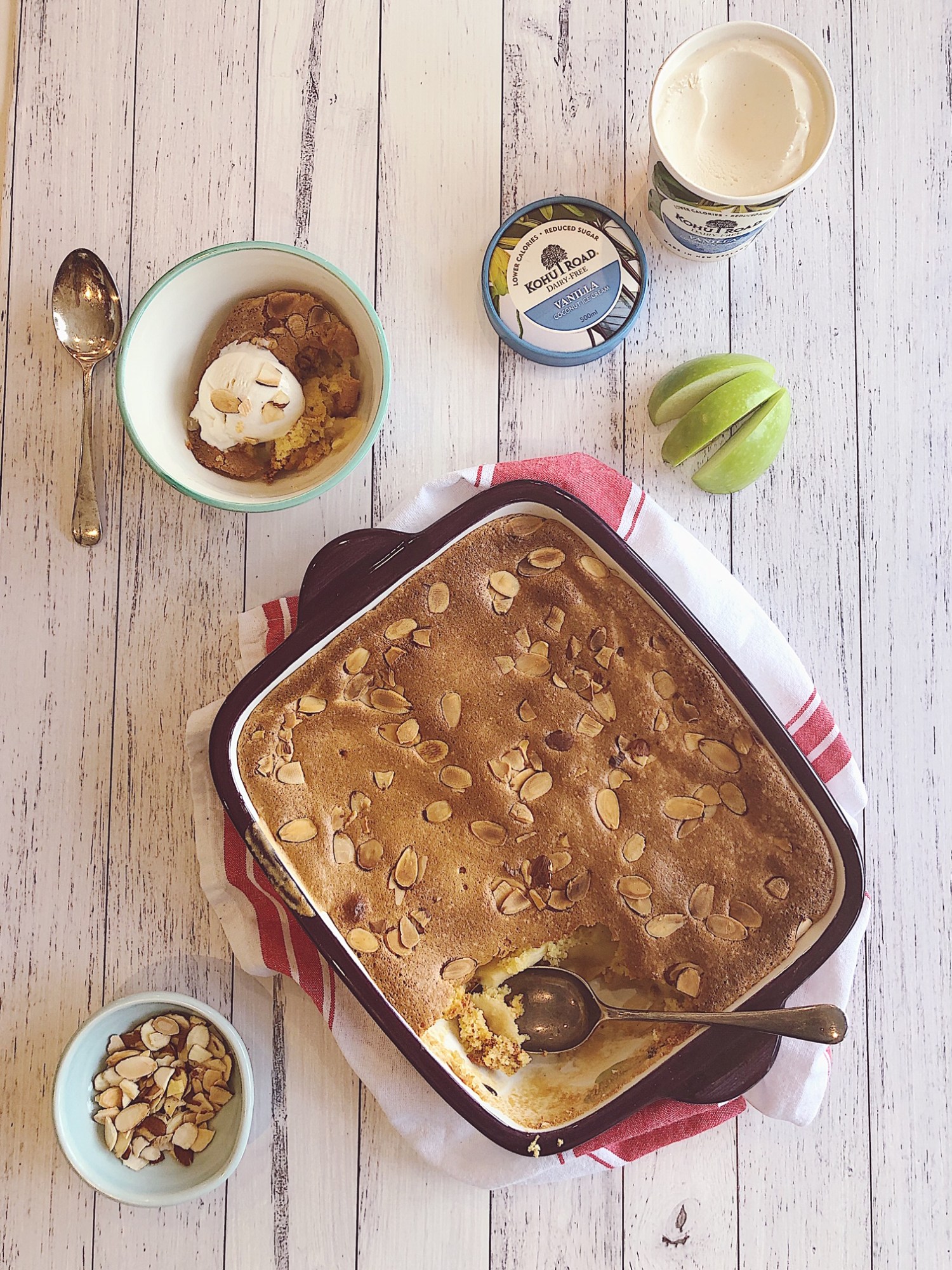 Spoon it over the cooled apples and then sprinkle with the sliced almonds.